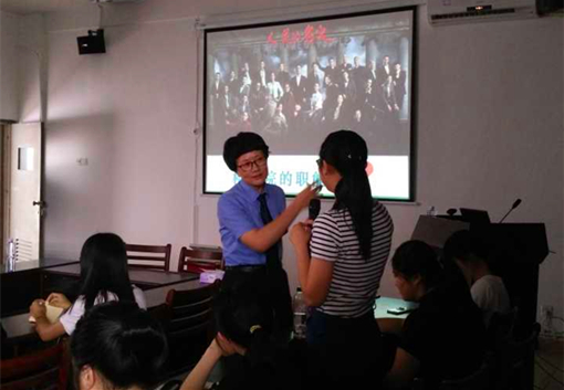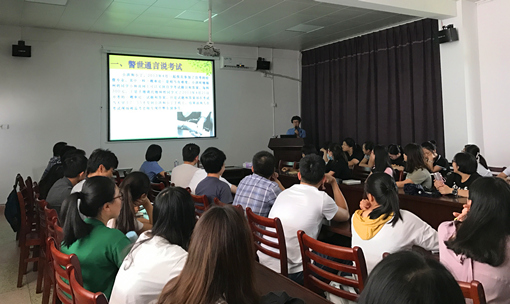 杨亦红向在场师生讲解法治的概念及其重大意义。她以热播的电视剧《人民的名义》向大家介绍人民检察院的职能是维护法治的威严性与存在性。紧接着,她列举大学生中出现的考试舞弊、诈骗、盗窃、校园贷和故意伤人等违法违纪案例,告诫青年大学生要培养健康强大的心脏,树立正确的价值观,遵守国家的法律法规。