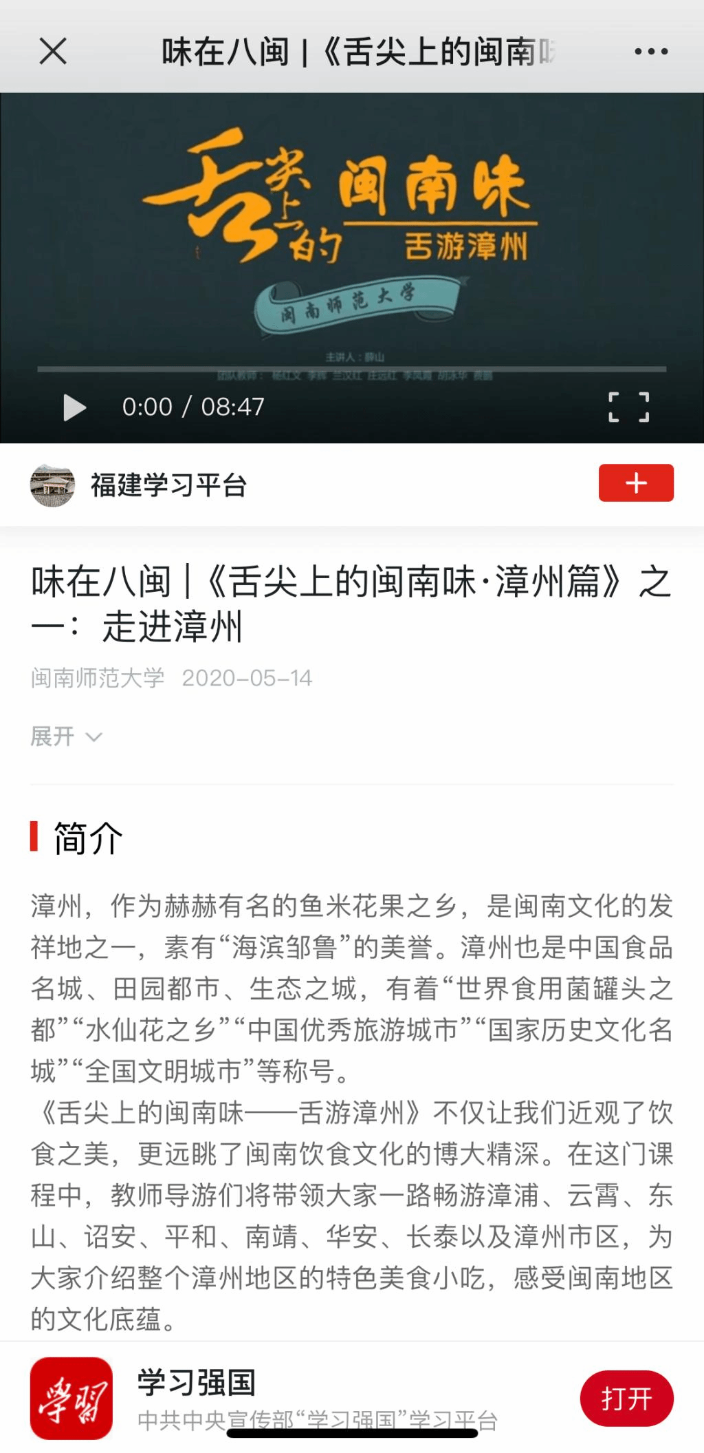 薛山老师主讲的精品在线课程《舌尖上的闽南味——舌游漳州》于5月14日登陆学习强国平台本地频道,这也是我校首门上传学习强国的课程。