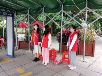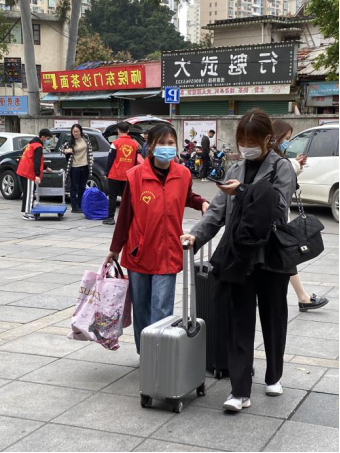 的志愿者们分别在学校的东门、西门、南门等候着生科学子的归来,迎接同学们回家。一身红衣显正气,他们的背影定格学期伊始的全新面貌、开启学期崭新气象。
