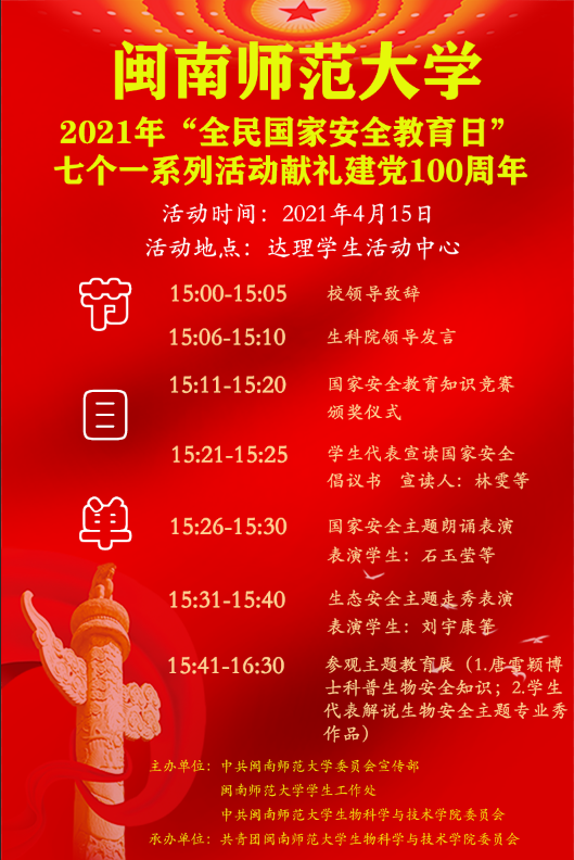 紧密结合各专业特色,开展有意义、有特色、有实效的国家安全教育宣传系列活动:一场主题党团活动,一堂国家安全教育课,一次生物安全学术研讨活动,一次国家安全知识竞赛,一场主题专业秀活动,一次主题承诺签名仪式,一次主题作品征集活动。