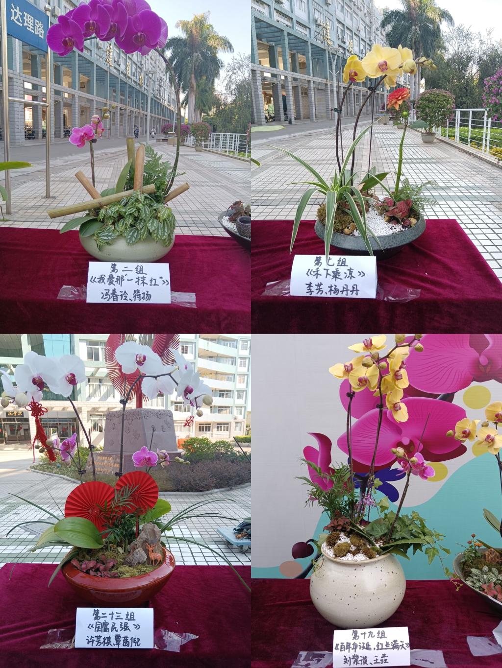 此次主题组合盆栽大赛突显党的百年辉煌历史,以组合盆栽作品的形式生动再现,作品集思想性、教育性、艺术性于一体,表达了师生对中国共产党的热爱和深切祝福。作品《我爱的那“一抹红”》 ,以红色蝴蝶兰为主材料,红色即中国红,花语“我爱你”,寄托对华夏的深沉的爱;作品《禾下乘凉》,带我们进入了袁隆平爷爷“稻穗比高粱还高,穗粒比花生还大”的梦,祝愿祖国的农业事业越来越兴盛;作品《国富民强》用中国元素,表达对祖国的美好祝愿,希望祖国越来越繁荣昌盛;作品《百年华诞,红兰满天》红色蝴蝶兰如蝴蝶飞舞,如中国共产党百年华诞,今朝欣欣向荣之景象。