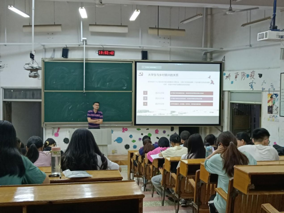 课上,沈老师结合自身驻村工作经历,用朴实的语言,生动的事例围绕什么是乡村振兴;为什么要施行乡村振兴;乡村振兴的基本内容;大学生与乡村振兴的关系和乡村振兴当中的分享等五个方面展开,让还在象牙塔里的同学们对国家乡村振兴战略有了更详细的了解。沈老师着重分享了乡村振兴战略与大学生的关系,他强调,实现乡村振兴战略是新时代农业农村现代化的新起点新征程,也是我们新时代大学生大展身手的一个绝佳机会,大家一定要好好把握住这次机遇,努力学习专业的知识,夯实专业技能基础,精准把握时代动向,为服务乡村振兴、响应国家号召做好充足的准备。