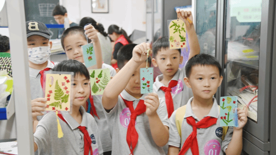 随后,同学们在专业老师的介绍下了解了古法蓝晒和压花工艺并亲自体验。古法蓝晒是将提前配制好的蓝晒液刷到底纸上,待风干后将叶片等素材轻轻放置,再经过曝光、冲洗、定影等步骤就形成独特的艺术效果。压花则是同学们从提前压好的花材中挑选了心仪的材料,在卡纸上摆放出想要图案再用胶水粘粘,塑封打孔,制作专属书签。