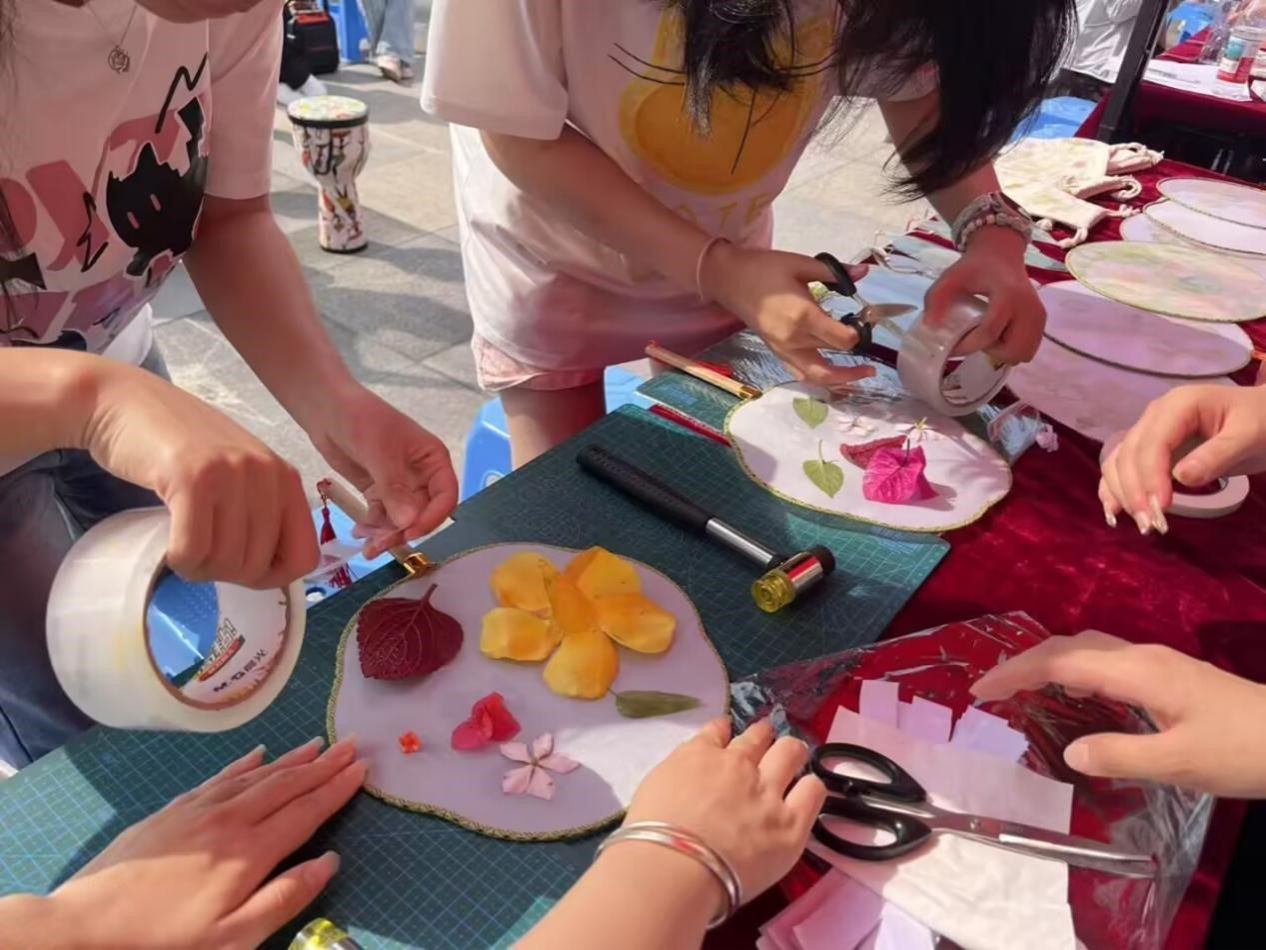 心理辅导站“植物拓染” 创意工坊凭借独特的疗愈形式与暖心设计,成为活动现场的焦点,吸引众多师生参与体验。