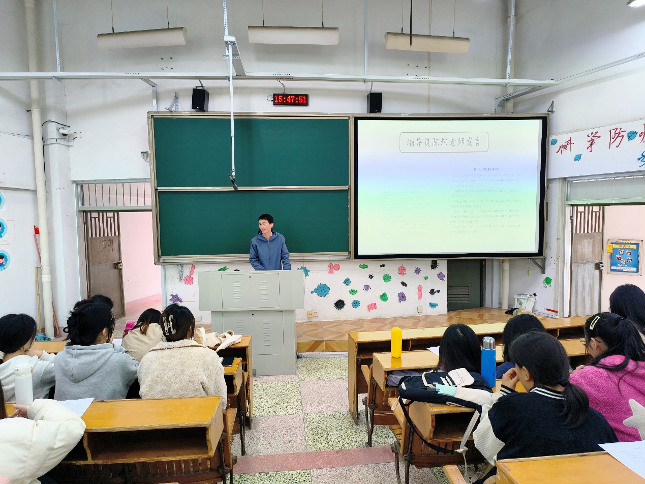 辅导员陈炜老师表示,同学们应该及时调整心态,做好在校学习与实习的过渡衔接。接着陈老师鼓励同学们应该加强与学长学姐的交流,汲取实习经验。最后陈老师详细为大家介绍实习期间的请假规则。并嘱咐实习过程中,同学们要提高自身安全意识,保护好自己,做自身安全的第一责任人。