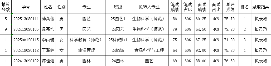 根据《bl动漫 普通本科生转专业管理办法》(闽南师大〔2022〕60号)及bl动漫 转专业工作方案(2025-2026学年)文件,坚持学生自愿申请、学生和专业双向选择,在公平、公正、公开的基础上,对学生专业基础知识、综合能力等方面进行综合考核,经学院教学指导委员会及学院党政联席会议审议通过,现将拟转入名单公示如下: