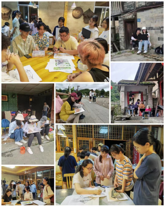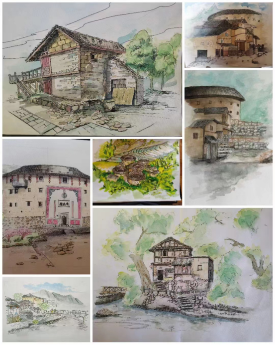 该次写生实习任务繁重,师生克服潮湿阴雨天气,在南靖的群山间、土楼里、溪流边耐心创作,悉心指导,留下了一幅幅土楼文化遗产的淡彩佳作。实习的每一天里,同学们白天现场写生,老师们晚上集体评图总结,在五天的过程中学生写生的艺术表达水平迅速提升,对世界文化遗产的认知逐步深入。