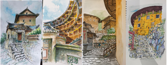 本次综合实习任务艰巨,师生顶着烈日高温天气,在南靖的山水旁,土楼里认真观察,仔细描绘。在实习的每一天里,同学们认真完成指导老师布置的各项任务,并与老师们沟通探讨,艺术表达能力迅速提升。