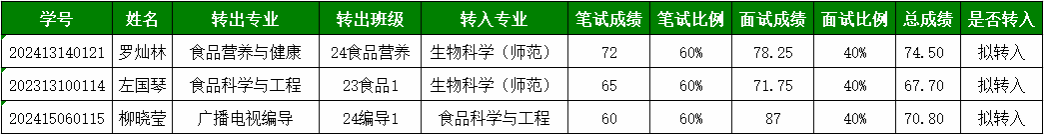转专业工作方案(2024-2025学年)文件,学院于2024年11月30日上午进行转专业笔试,于2024年12月5日下午进行转专业面试考核,根据公开、公正、公平的原则,经学院教学指导委员会及学院党政联席会审议通过,最终确定以下人员符合转专业转入条件,现将结果公示如下: