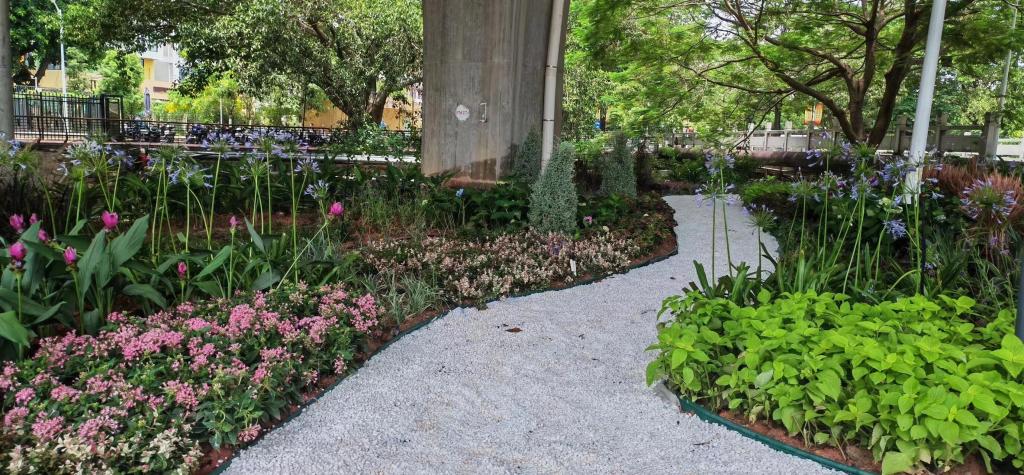 20级风景园林专业的同学们在专业老师指导下,设计出不同的花境方案,综合考虑场地实况、校园文化以及资金方面之后,最终确立了其中一个方案。整个6月份,同学们从分配现场点位进行现场勘查,再修改完善设计稿,准备建造材料,进场进行建造。在专业老师、辅导员的现场耐心指导下,花境面貌就已经跃然于眼前。