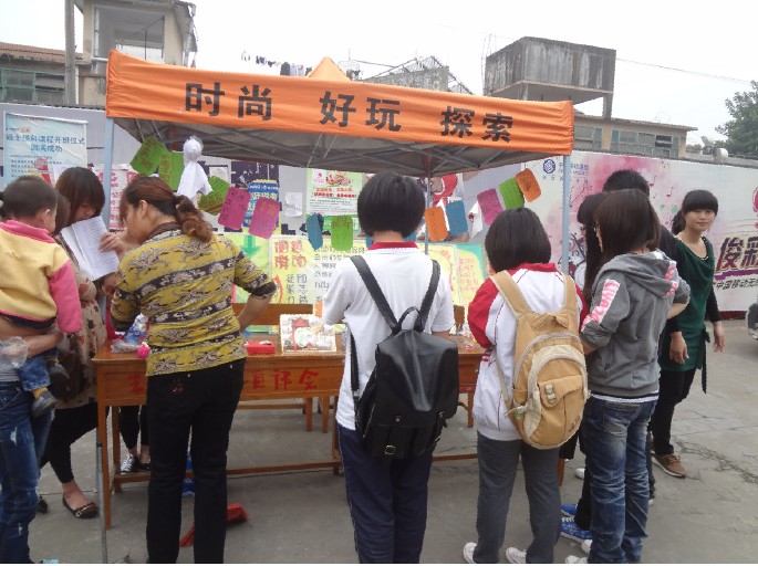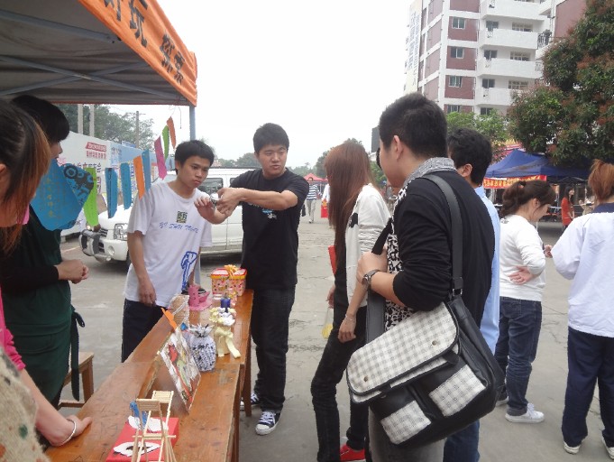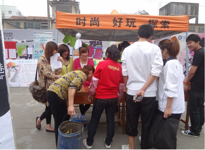 活动由志愿者分队内部人员做一些精致的废物利用的成品,活动当天展示在活动现场吸引同学的注意。志愿者们向同学们细心解释废物利用的好处,活动期间可由志愿者现场教同学们做一些废物利用的小东西,感兴趣的同学可以当场学习,也可领走废物利用的小成品一个。与同学们间有个很好的交流,从而达到良好的宣传效果,让同学们更深一步的认识到节约与环保。
