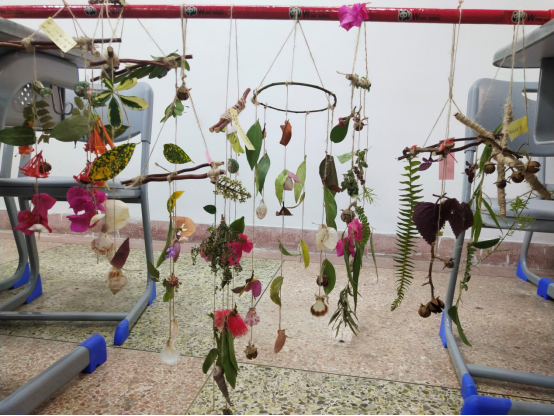 风铃制作的材料为校园内的树叶、枝条以及各式贝壳海螺。志愿小队通过风铃样品展示,吸引同学参与活动,风铃的制作于博西201教室进行,志愿者引导前来参与的同学签到、挑选材料、帮助参与的同学顺利完成风铃作品。风铃寓意着思念、寓意着平安,大家在制作风铃时附上寄语一同表达对留守儿童深深的祝福,活动中制作的风铃在达南一楼大厅进行展示。