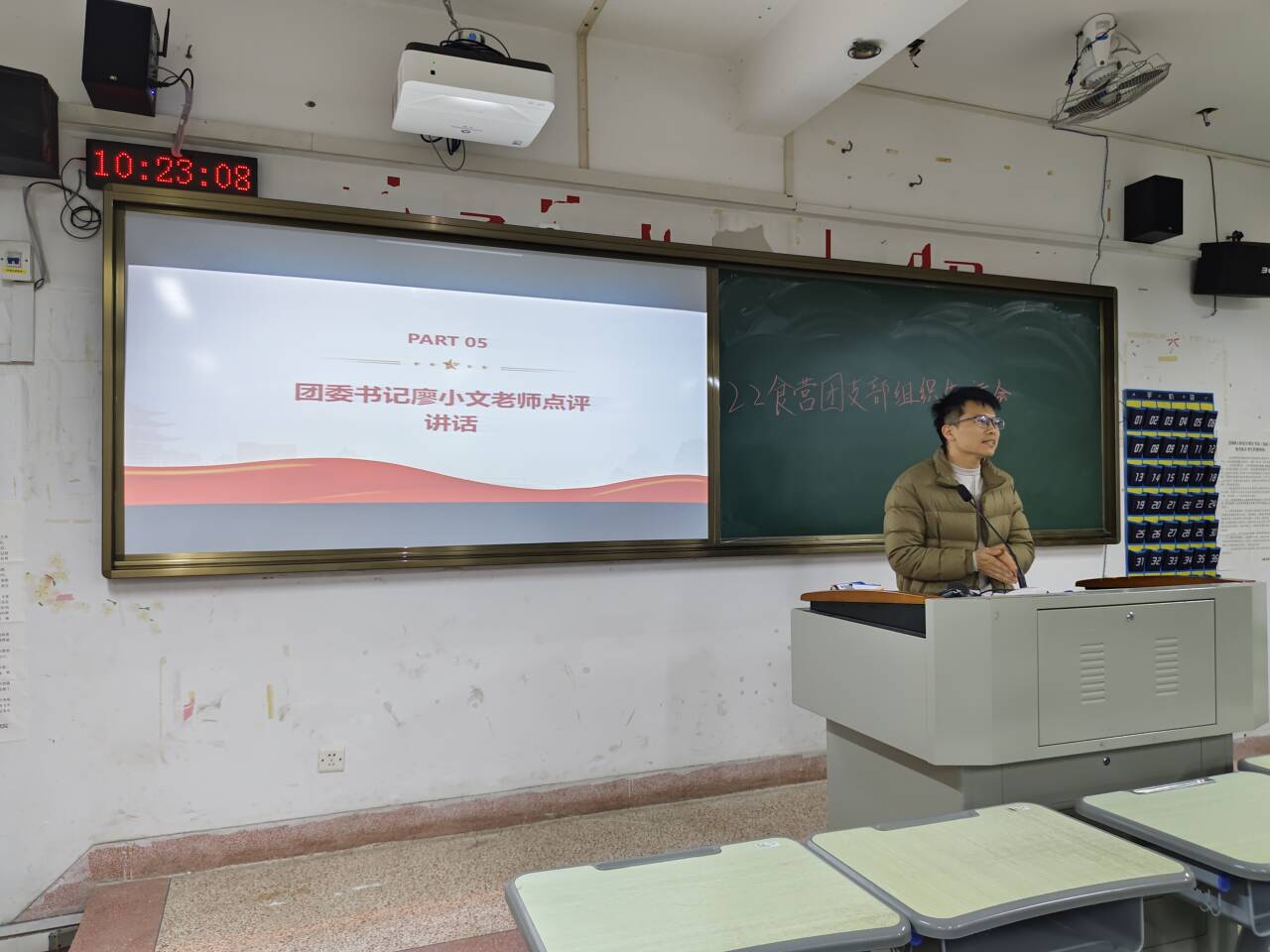 主评议环节,全体团员同学结合团员日常工作表现和参加团员和青年主题教育情况,进行了民主评议活动,选出30%的优秀团员。民主评议后,学院团委书记廖小文老师作点评讲话。 最后,团支部全体团员同学在廖小文老师带领下重温入团誓词,在团旗下面庄严宣誓。誓词唤起了团员们的团员意识,激励各位团员在今后的学习工作中坚定理想信念、勇担青春使命、实现人生价值。