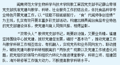 教工第四党支部由食品系——食品科学与工程教研室和食品质量与安全教研室13名党员组成,其中教授1人、副教授9人、讲师3人;博士10人、硕士3人;双师型教师6人;支部书记由“双带头人”薛山同志担任,其先后任食品系主任、院长助理。近年来,在学校党委及学院党委的领导下,支部从实际出发,加强政治建设、思想建设、组织建设、作风建设、纪律建设,把制度建设贯穿其中,先后获批校级首批双带头人样板工作室,省级样板支部,全国样板支部和省级双带头人支部书记工作室,形成了具有闽台食品特色的食品科学专业党支部建设体系,即狠抓“一个基础”(党支部自身建设),共振“两个核心”(党员队伍建设与人才培养建设),构建“三种型式”(教学型、科研型、服务型支部建设),注重“四项结合”(双创融合、专业特色、支部特征、党员特长),扎实有效地开展全国党建工作样板支的建设任务。