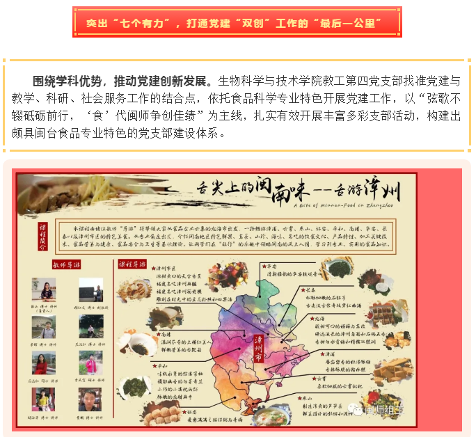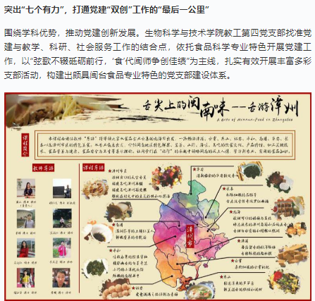 以支部党员为主体的教师团队精心打造的《舌尖上的闽南味——舌游漳州》在线课程,获2018年福建省精品在线课程,《食品安全与卫生学》课程获批2020年省级一流混合式金课。两门金课先后登陆学习强国平台,反响强烈。此外,支部党员还打造有《食品试验设计与统计分析》省级线下一流课程,《3D 啤酒发酵工艺虚拟仿真实验教学项目》省级虚拟仿真实验教学项目,以及《食品贮藏与保鲜》、《焙烤加工实验》、《食品工艺学概论》校级线下一流课程。