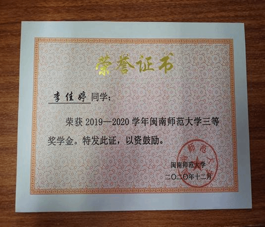 当李佳婷学姐回忆起大学生活,她感慨万千。学姐表示存在自己记忆的最深处的,就是我们闽师大的校训:博学、明理、砺志、笃行。学姐大学期间没有忙碌于社团干部工作,而是另辟蹊径,全身心投入专业知识的学习和自身能力的提升。当我向学姐讨教大学如何学习时,学姐这样答道:“其实,我并没有什么特别的学习方法,只是一步一个脚印。首先,我认为保证课上的学习效率是排在第一位的。大部分大学生都不情愿占用太多课余时间去学习,这就意味着要在课上把知识当堂汲取。其次,给自己支配一个固定时间固定打算的自习室,把课上的笔记看看,老师留的作业做做,也顺便了解一下下节内容。做这些事情,只需花费两小时左右,但是效果却是意想不到的。学习就是要建立在不断地反复当中的。在我的学习生涯中,的确还有件事给我留下了深刻的印象。在我还没有学专业课的时候,老师就灌输给我们“某某学科是门很难的学科”的思想,我是一个不爱服输的人,战胜它的思想早早在我脑海里埋下种子。当我开头学习的时候,的确感觉很难,但是我会很仔细和耐心地对待它。”如此自律、严格要求自己的李佳婷学姐,在校期间终是获得了国家励志奖学金、专业奖学金、创新创业奖等奖项。这些奖项就是学姐每个日日夜夜苦读最好的答案。